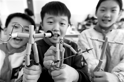 近日,安徽省阜阳市颍东区育新小学颍河校区学生在教室内展示自己动手制作的“竹节人”。该校区结合课文《竹节人》,组织学生分成兴趣小组,找来竹节、细绳、瓶盖、小刀以及彩笔等工具,自己动手制作“竹节人”,让孩子们“学中做”“做中学”,以灵活教学方式助力“双减”。王彪 摄