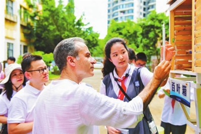 ⑤海口市五源河学校学生向联合国教科文组织专家展示研究项目。