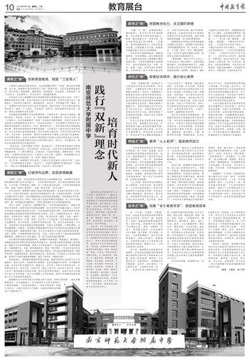 2020年,《关于遴选建立普通高中新课程新教材实施国家级示范区和示范校的通知》发布,并公布了相关示范区和示范校名单。南师附中作为江苏省3所示范校之一,开始了深化高中课程改革、推动育人方式变革的有益探索。3年多来,南师附中严格遵守教育部门相关规定,秉承“锐意实验”传统,以学生“全面而卓越”发展为目标,以“融通生长”为样态,以“课标引领、课程统整、教材落实、项目推动、分组实施、多元整合、体系建构、积极尝试、理性分析、机制创新、多校联动、辐射引领”为策略,围绕“课程体系、课程组织、教学改革、考试评价、校本教研、教师团队”六个方面,构筑顶层设计蓝图,积极推动新课程新教材(以下简称“双新”)顺利落地,培养担当民族复兴大任的时代新人。