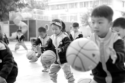 10月23日,在江苏省淮安市高良涧幼儿园,小朋友们在做趣味篮球操。该园针对幼儿身体成长和兴趣,排练趣味篮球操,让孩子们爱上运动。 殷潮 摄