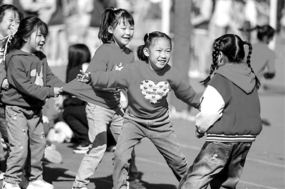 10月29日,在青岛市李沧区虎山路小学,学生在课间进行“老鹰捉小鸡”游戏。今年以来,李沧区在全区小学实行课间10分钟延长至15分钟。各学校根据实际情况开展丰富的课间活动,促进学生健康成长。 张鹰 摄
