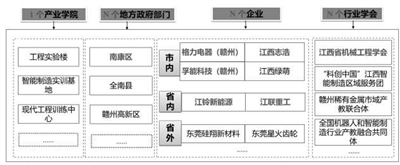 构建“1+3N”智能制造应用型人才培养体系。学校按照“政校企会”模式成立了智能制造、电子信息等现代产业学院,与政府部门和企业合作,目前已形成了1个产业学院与N个政府部门、N个企业、N个行业学会的“1+3N”模式,并成立产业学院理事会、专家指导委员会与教学指导委员会,探索和建立人才链、产业链、创新链、教育链有效衔接的资源共享、产教协同机制,构建“教育+培训+服务+就业+创业”的完整人才培养服务链与多方协同育人良好生态,打造融人才培养、科学研究、技术创新、企业服务和学生创业等功能为一体的示范性培养实体,逐步形成“1+N³”深度融合效果,在服务地方区域制造业和赣州革命老区高质量示范区建设上作出贡献。