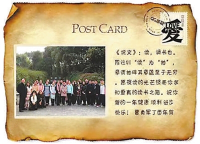从2014年寒假我带着15个学生第一次到先锋书店购书读书开始,到后来参加人员从经典夜读小组学生扩展到启明星读书社骨干,人数越来越多,轰轰烈烈,成了我们的读书节日,一晃到今年已经走过了11年。我喜欢把自己与学生在先锋书店门口的合影做成电子贺卡,在大年初一发给学生。2014年的贺卡,我写下了这样一段话,表达我对学生的祝福:“愿爱知求真的燃灯者精神,传递开来,传递下去,照亮所有的人!祝大家快乐进步!——你们的老曹。”而2017年的贺卡,我写下另一段话,表达对学生的鼓励:“《说文》:读,诵书也。段注训‘读’为‘抽’,意谓抽绎其意蕴至于无穷。愿夜读的光芒照亮你求知爱真的读书之路。祝你新的一年健康、顺利、进步、快乐!曹勇军丁酉年贺。”