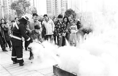 ②江苏淮安生态文旅区消防救援大队消防员指导学生们使用灭火器。