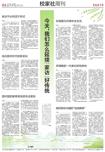 家访,曾是我国基础教育的好经验和好传统。然而,随着时代的发展,这种家校联结的方式正面临新的挑战。新时期还要不要家访?如何家访效果更好?校家社周刊请读者特别是一线教师就“家访”问题发表看法和意见,现择优选取部分稿件刊发,敬请读者关注。