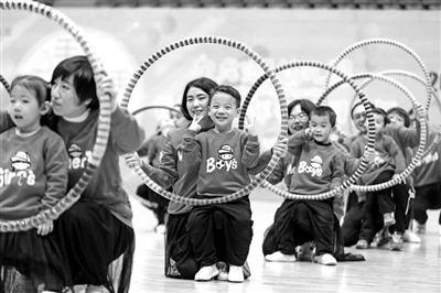 家长和孩子跳“圆圈舞”。