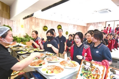 ③ 6月5日,江苏省南京市第九中学食堂推出为考生特别定制的爱心营养餐。新华社发(杨素平 摄)