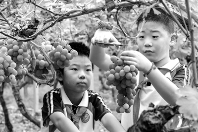 九月一日,浙江省湖州市长兴县吕山乡中心小学校外劳动实践基地里,学生们正在采摘葡萄。 通讯员 周洪峰 摄