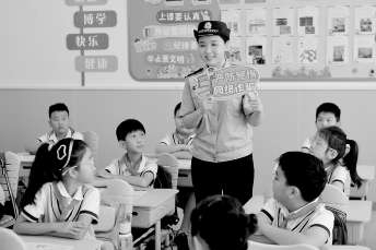 在山东省青岛市市北区延安二路小学,民警为学生们讲解严防网络诈骗知识。王海滨 摄