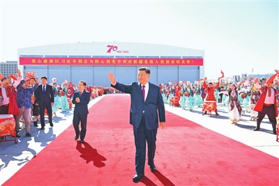 中共中央总书记、国家主席、中央军委主席习近平在乌鲁木齐出席新疆维吾尔自治区成立七十周年庆祝活动后,九月二十五日中午乘专机返回北京。这是习近平在乌鲁木齐天山国际机场向前来欢送的各族群众挥手致意。 新华社记者 谢环驰 摄