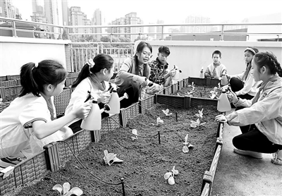 湖北省武汉市洪山区未来实验小学学生在教师指导下浇灌作物。