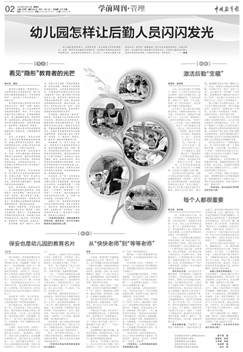 幼儿园既有教师岗位,也有保育员、卫生保健人员等后勤岗位。通常,教师专业发展被讨论得较多,但后勤人员的职业成长同样值得关注。他们有的是种植专家、手工达人,如果幼儿园善于发现并运用,他们的“隐藏技能”就可以成为教育的助力。本期学前周刊,我们探讨幼儿园后勤人员角色定位,以及幼儿园促进后勤人员成长的案例和策略,以期分享经验,共同进步。——编者