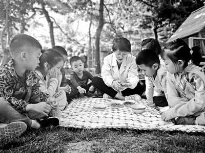 保育员王淑红原来在服装厂工作,懂裁剪技术。一次,教师李敏参加青年教师基本功大赛,需要沙包教具。为让布料、大小规格更加合适,王淑红参与到了教学现场中来。了解教师的要求后,她连夜缝制了20个沙包,保证了第二天的教学活动顺利完成。就这样,保育员把传统手艺变成教育手段,和专任教师一同站在了教学现场。