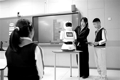 10月15日,在北京市海淀区第四实验小学《闪烁信号》主题人工智能公开课上,学生通过自己编写的程序向机器人发指令。新华社发