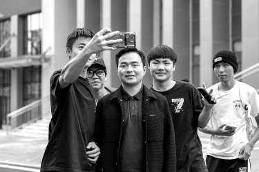 10月29日,郑棋元(中)在讲座后被学生拉住合影。