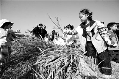 近日,浙江省湖州市吴兴区东林镇保国村东林镇中心幼儿园的小朋友在体验拾稻穗。 何伟卫 摄