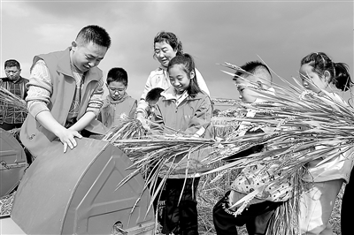 在江苏省海安高新区隆政街道联合村俞万家庭农场举办的“金秋稻田 相遇重阳”稻田游园会上,家长和小朋友体验农耕劳动。 通讯员 顾彬斌 摄