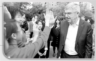 国际奥委会终身名誉主席巴赫在张槎中心小学与学生互动。柱子 摄