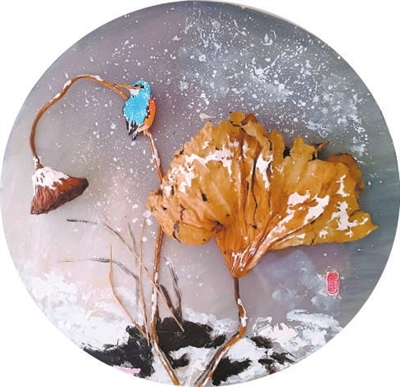 国画装置手工作品(主要材料:枯荷叶、泡沫板、宣纸)