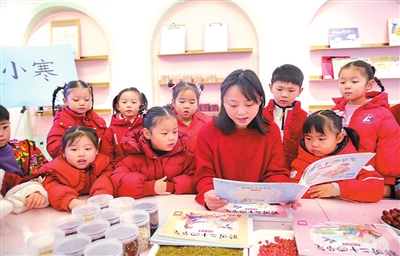 1月5日,在位于江苏省如皋市如城街道的新城幼儿园内,孩子们一起聆听小寒节气绘本故事。徐慧 摄