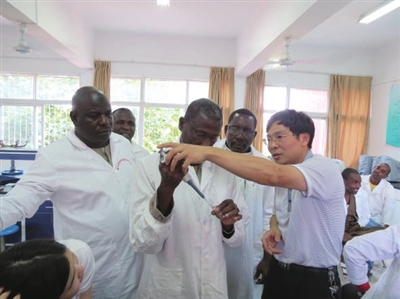 学校动物(食品)科技学院院长、教授陈文钦指导尼日尔学员进行课堂实验