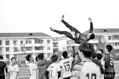 足球赛后,学生举起队友欢呼庆祝。 梁文婷 摄