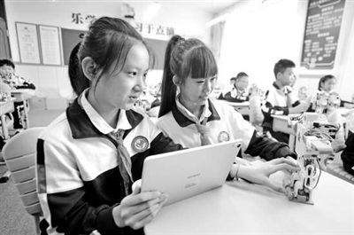 近日,山东省青岛市市北区平安路第二小学开展“校园科技之光”主题活动,学生用平板电脑编写程序操控机器人。王海滨 摄