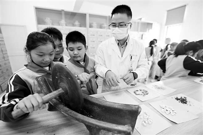 10月22日,在浙江省湖州市德清县乾元镇中心卫生院,镇中心小学学生体验用“铁药碾”碾磨中药。