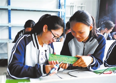 黄梅一中学生在电子制作课程上拼装电子元件。学校供图