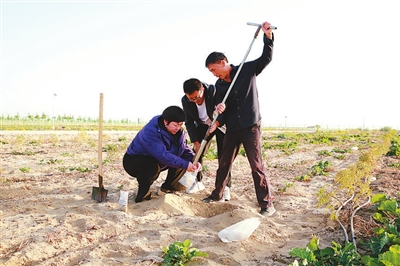 韩刚团队成员哈力娜(左)在新建枣园采集土壤样本。