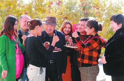 新疆沙漠枣业有限公司董事长、策勒县智慧果业农民专业合作社理事长李鹏(左二)与当地群众一起品尝红枣,享受丰收的喜悦。