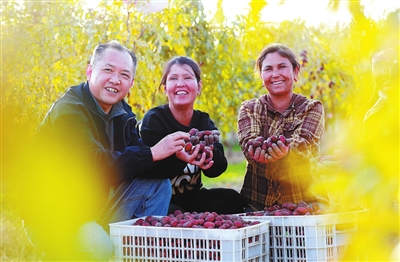 在新疆和田地区策勒县策勒乡阿日希村的西北农林科技大学南疆经济林果示范园里,红枣专家韩刚(左)与村民一起采收红枣。
