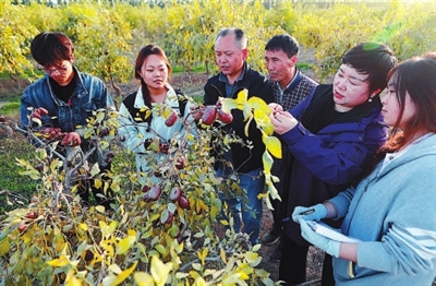 西北农林科技大学南疆经济林果示范园里,红枣专家韩刚(左三)与团队师生一起分析不同品种枣树的生长结实情况。