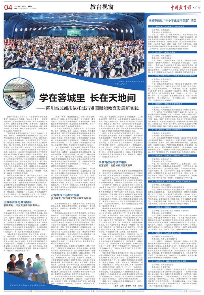 2025年10月23日至24日,“成都市中小学生城市课堂”系列活动拉开帷幕。“遗址上的课堂——我来金沙讲堂课”在金沙遗址博物馆举行,来自成都高新区锦城小学、成都市七中育才学校(汇源校区)、成都市教育科学研究院附属中学和崇庆中学的近200名师生把课堂搬到了考古现场。师生们走进考古遗址,沉浸式解锁学习古蜀文明的新体验。 “这样的课真希望有100节。”孩子们兴奋地说。上课前,教研员、学科教师和博物馆研究人员一起,对文物资源进行针对中小学生的教学设计转化,融合化学、历史、美术等多学科内容,结合实景研学设计了互动性强、启发性足的课程。例如,学生在青铜模拟实验中调整铜、锡、铅的比例,看着合金从泛红变为泛青,忍不住惊叹“古人的黑科技”。在这里,古蜀文明不再是教科书上冰冷的文字,文物也不再是玻璃柜中遥不可及的展品。在此之前,来自四川天府新区的香山中学和华阳中学200余名师生和40余位教研员、科学副校长,来到科创生态岛、天府兴隆湖实验室、国家川藏铁路技术创新中心等场馆开展学习,科技人员和教研人员协同开发了专门的课程资源,并采取探究式学习方式,把学科教学搬进了真实运行的科技企业与科普场馆,教师们教得有劲,学生们学得开心。据悉,成都市还将在人造太阳“中国环流三号”、成都市超算中心等标志性点位陆续开发“城市课堂”研学课程,提供满是“科技感”“成都味”的跨学科实景化教学资源。 城市是孩子成长的课堂,孩子是城市的未来。当课堂不再局限于教室四壁,当知识的学习与一座城市的文化、科技、历史、自然景观深度融合,教育便拥有了无限的广度与深度。“遗址上的课堂——我来金沙讲堂课”是成都市推动城市资源赋能教育发展的一个缩影。近年来,成都市全面贯彻党的教育方针,遵循教育规律,创新推动中小学教育与城市资源深度融合,聚焦“思政德育、科技创新、实践探索”三个方面,有力推进教育科技人才一体发展,着力构建科技与教育、人文与科学、课堂与社会、知识与实践深度融合的实践育人新格局。 让城市资源与教育相连 系统谋划,建立资源库与供需平台 教育与城市从来都是相互促进、共生共荣的关系。教育为城市提供人才支持、科技支撑和文化底蕴,而城市的繁荣与进步则为教育提供丰富的资源和广阔的发展空间。类似于“遗址上的课堂——我来金沙讲堂课”这样的互动,在成都还有很多:在“城市科学大讲堂”里,全市师生能与航天员叶光富探讨宇宙奥秘,也能和中国科学院院士翟婉明讨论未来的轨道交通;在成都环城绿道上,师生在春日里探秘油菜花田,也在秋收稻谷时感悟劳动创造的成果;在杜甫草堂、武侯祠,师生们“对话先贤”,来一场穿越千年的城市诗意研学…… “城市资源的分配和利用,落地到学校,存在着一些‘校际差距’。要实现资源的优质均衡,惠及每一所学校,必须有系统的顶层设计。”成都市教育部门相关负责人介绍,2025年10月,由成都市教育部门联合科技部门等多部门共同制定了《城市资源赋能教育发展工作方案》(以下简称《方案》)。这一文件的出台,标志着成都市在城市资源赋能教育发展、创新育人实践中迈出了制度化、系统化的重要一步。 《方案》明确,坚持协同推进,构建“区县主体、部门协同”机制,推进科技与教育、人文与科学、课堂与社会、知识与实践的深度融合。促进优质均衡,强化优质资源的统筹协调,优先满足县市新城学校、乡村小规模学校在实践育人方面的资源需求。 在这样的系统设计下,成都市围绕“建设一批课程、组织一批展览、建强一支队伍”等要求,明确建设城市资源库、研学课程库和城市资源赋能教育共享平台等工作任务。在运行体系方面,构建“学校申报需求—分级协调资源—学校组织实施—分级评估优化”工作流程。并明确由成都市教育部门牵头,市科技部门等部门和单位协同联动,区(市)县教育行政部门指导学校落实,通过多部门协同、跨层级分工的方式推动工作运转。 “通过多部门协同、跨层级联动,推动城市资源真正‘流动’起来、‘下沉’到校。”成都市教育部门相关负责人介绍,成都市一方面通过汇聚城市特色资源、行业产业资源、优质专家资源,建立起了“城市资源库”;另一方面,则是供需平台的搭建,通过建立市级“城市资源赋能教育共享平台”,定期汇总各类学校的资源需求清单并发布市级部门和区(市)县的资源供给清单,为成都市中小学校提供资源点位、专家人才、共享课程等预约通道和共享载体。 成都市在加强市级资源统筹供给的基础上,同时推动各区(市)县结合区域资源禀赋,打造特色场景。比如,成都市邛崃市深挖辖区内红军长征纪念馆、文君故里、川西竹海等资源,开发传承、人文、生态、科技、农耕5类资源课程体系,既满足区域内中小学校教学需求,又有序向全市其他区(市)县共享。通过各区域全面梳理科学教育、人文艺术、劳动实践等资源,加强与属地高校、科研院所、科技企业、科普基地等结对共建,形成了多元化的区域资源供给机制和应用模式,让城市资源与教育真正相连。 让学生成长与城市相融 实践探索,“城市课堂”让教育没有围墙 在系统机制的支撑下,成都各区(市)县和学校纷纷行动起来,依托城市特色资源,设计实施了一系列具有代表性、创新