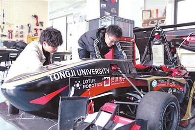 同济大学汽车学院学生正为一辆燃油方程式赛车调试电机。 顾超 摄