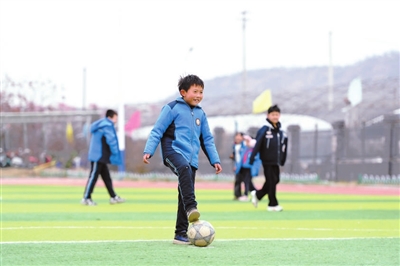 11月26日,在山西省临县湫水柏林苑易地扶贫搬迁安置点的临县高级中学附属柏林苑学校,学生们在踢足球。2019年,临县1361户村民陆续搬迁至湫水柏林苑易地扶贫搬迁安置点,告别了土壤贫瘠、交通不便的山村,开始过上安居乐业的新生活。