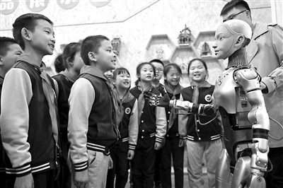 在合肥师范附属小学,仿生机器人安妮作为助教走进课堂,与专业老师协作,给学生讲了一堂前所未有的科学教育课。视觉中国供图