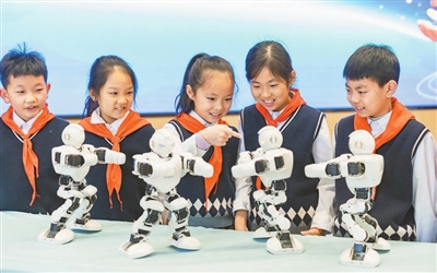 近日,江苏省海安高新区实验小学的学生在校园科技节上观看智能机器人表演。连日来,该校举办“科技润童心 创新筑梦想”校园科技节,学生通过视觉体验、科技创想等形式,感受科技魅力。翟伟凯 摄