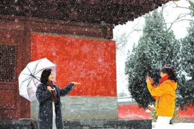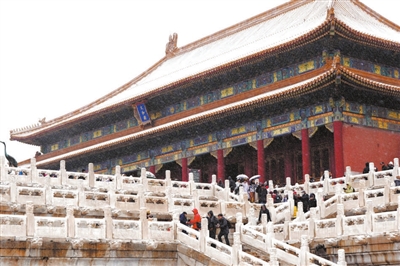 北京迎来今冬首场明显降雪,游客在北京故宫冒雪游览。