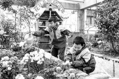 在湖北省襄阳市松鹤路小学教学楼顶的“空中花园”里,学生们在教师指导下养护盛放的菊花。 李旭晖 摄