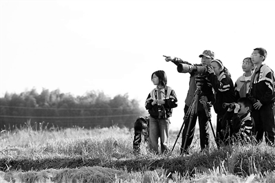在位于安徽省池州市的十八索省级自然保护区,茅坦小学的学生在野生鸟类保护志愿者的带领下用相机记录鸟类。 新华社发(张端 摄)