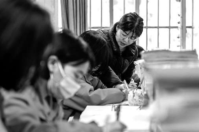 12月13日,华坪女高第一届毕业生、华坪女高数学教师周云丽(右一)在为学生讲解题目。