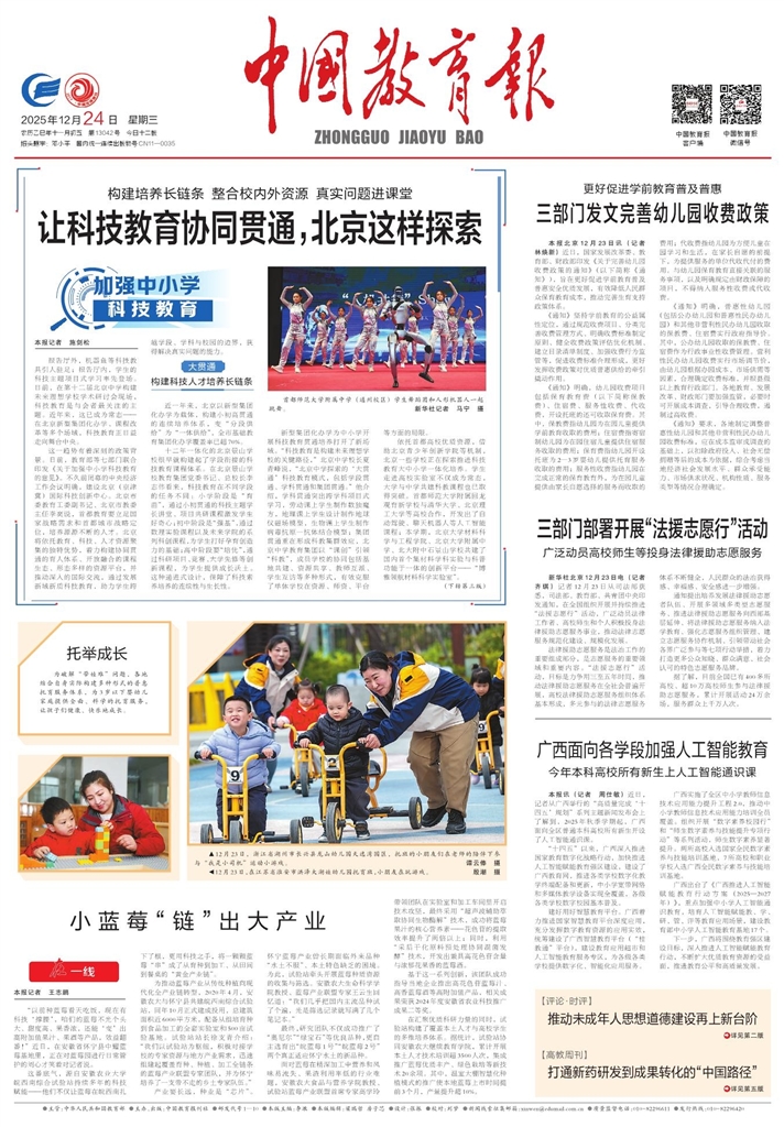 报告厅外,机器鱼等科技教具引人驻足;报告厅内,学生的科技主题项目式学习率先登场。日前,在第十二届北京中学构建未来理想学校学术研讨会现场,科技教育是与会者最关注的主题。近年来,这已成为常态——在北京新型集团化办学、课程改革等多个场域,科技教育正日益走向舞台中央。 这一趋势有着深刻的政策背景。日前,教育部等七部门联合印发《关于加强中小学科技教育的意见》。不久前闭幕的中央经济工作会议明确,建设北京(京津冀)国际科技创新中心。北京市委教育工委副书记、北京市教委主任李奕说,首都教育要立足国家战略需求和首都城市战略定位,培养源源不断的人才。北京将依托教育、科技、人才资源聚集的独特优势,着力构建协同贯通的育人体系、开放融合的课程生态、形态多样的资源平台,并推动深入的国际交流,通过发展新域新质科技教育,助力学生跨越学段、学科与校园的边界,获得解决真实问题的能力。 大贯通 构建科技人才培养长链条 近一年来,北京以新型集团化办学为载体,构建小初高贯通的连续培养体系,变“分段供给”为“一体供给”,全市基础教育集团化办学覆盖率已超70%。 十二年一体化的北京景山学校很早就构建起了学段衔接的科技教育课程体系。在北京景山学校教育集团党委书记、总校长李志伟看来,科技教育在不同学段的任务不同:小学阶段是“育苗”,通过小初贯通的科技主题学长讲堂、项目共研课程激发学生好奇心;初中阶段是“强基”,通过数理实验课程以及未来学院的系列科创课程,为学生打好孕育创造力的基础;高中阶段要“培优”,通过科研项目、竞赛、大学先修等创新课程,为学生提供成长沃土。这种递进式设计,保障了科技素养培养的连续性与生长性。 新型集团化办学为中小学开展科技教育贯通培养打开了新场域。“科技教育是构建未来理想学校的关键路径,”北京中学校长夏青峰说,“北京中学探索的‘大贯通’科技教育模式,包括学段贯通、学科贯通和集团贯通。”他介绍,学科贯通突出跨学科项目式学习,劳动课上学生制作数独魔方,地理课上学生设计制作地球仪磁场模型,生物课上学生制作病毒抗原—抗体结合模型;集团贯通重在形成科教集群效应,北京中学教育集团以“课创”引领“科教”,成员学校的协同包括基地共建、资源共享、教师互派、学生互访等多种形式,有效克服了单体学校在资源、师资、平台等方面的局限。 依托首都高校优质资源,借助北京青少年创新学院等机制,北京一些学校正在探索推进科技教育大中小学一体化培养。学生走进高校实验室不仅成为常态,大学与中学共建科教课程也已取得突破。首都师范大学附属回龙观育新学校与清华大学、北京理工大学等高校合作,开发出了自动驾驶、聊天机器人等人工智能课程;本学期,北京大学材料科学与工程学院、北京大学附属中学、北大附中石景山学校共建了国内首个集材料学科实验与科普功能于一体的创新平台——“博雅领航材料科学实验室”。 目前,北京正在系统推进“1+3”培养实验、“课创计划”、“沃土计划”、“脱颖计划”、“苗圃工程”、新建科学高中等一系列改革。科技教育已不再是少数特长生的“竞技场”,而是面向所有学生的“素养营”。 新场景 打造“无边界学习场景” 北京十一学校通用技术课教师张晋源开发了一门“创意万物造”课程。项目组学生开发的AI青铜纹样键帽项目屡获大奖。这门迅速发展的课程背后是十一学校系统构建的科技教育新场景。2023年,十一学校重建了科创中心,包括以算力为中心的人工智能课程群学习区、以机器人为中心的智能制造课程群学习区和以工程与设计为中心的创新产品孵化课程群学习区。叠加理化生高端实验室和跨学科交流中心,这个科技教育新场景体系可承担全校15门技术课程与科学和工程课程教学需求,并满足全校学生科研科创、学术交流需求。 建设科教资源触手可及的学习社区同样是北京亦庄实验中学的选择。学校向学生开放的三级学习社区,包括学科功能教室,兼具实验室、阅览室、自习室等多功能,物理、化学、生物等教室配备实验台,助力学生在日常课堂中实现“做中学”;跨学科融合空间,包括中草药生态园、3D打印社区、创客工坊社区等跨学科跨领域的科学学习社区;高端实验室,包括物化生高端实验室、动量盒子社区、地理星空教室、智能编程教室、智能机器人社区等,支持学生科研需求。 不仅要做好校内科技教育提质,更要打破围墙,整合校内外优质教育资源。近一年来,北京市各区全面推进多元融通的科技教育模式新探索。东城区启动“馆校双师”合作,与中国科学技术馆共同打造“课堂+科技馆+实验室”实践场域;海淀区以科技教育提质、创新人才培育、科学教师队伍建设等五大工程为重点,设立20个科技教育项目;石景山区以“好课堂+大社会”为实施策略,打造“科幻+”区域特色活动品牌…… “传统科技教育多囿于校园场域,围绕课程、教材与考试展开;而在新域新质理念引领下,我们致力于构建开放融合的新型育人体系,推动学生跨越学科边界、校园围墙。”李奕说。 大协同 让学生从“解题”到“解决问题” “大家可以掂一掂它的重量,看看它和普通的石头重量一样吗?”北京天文馆高级工程师、首席科普专家寇文受聘