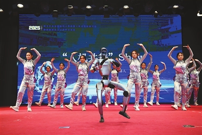 首都师范大学附属中学(通州校区)学生舞蹈团和人形机器人一起跳舞。新华社记者 马宁 摄
