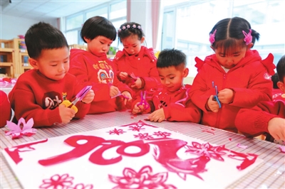 12月29日,甘肃省定西市安定区幼儿园的小朋友在制作手工迎新年。
