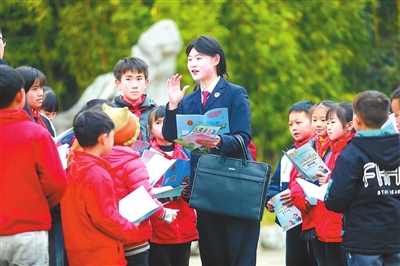 近日,检察干警在贵州省黔西市绿化白族彝族乡培育小学利用课间对学生进行法治宣传。视觉中国供图