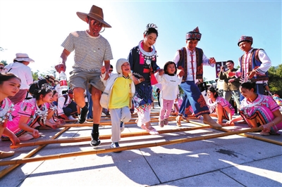 1月1日,家长带着孩子在海南省三亚南山文化旅游区跳竹竿舞。新华社发