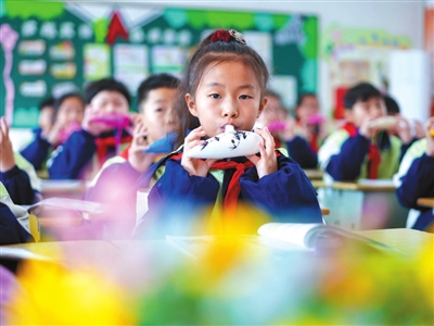 在江苏省兴化市新生中心小学,学生在音乐教师的指导下练习陶笛。