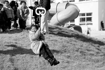 1月8日,浙江省诸暨市暨南街道街亭幼儿园的孩子在玩索道滑轮的游戏。陈霞芳 摄