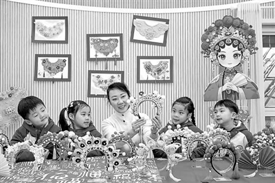 在安徽省合肥市长江路幼儿园天成分园,小朋友们学习京剧头饰制作。 赵明 摄